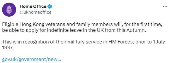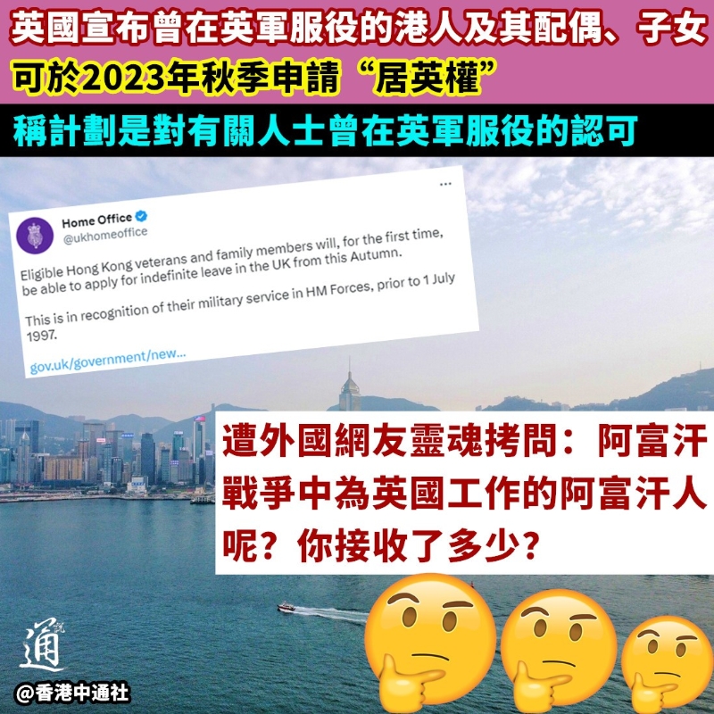 曾在英軍服役港人可申“居英權” 外國網友質問英國:那阿富汗人呢?香港新聞網3月31日電 英國又“缺錢”了? 英國內政部近日在社交媒體推特宣布,數百名1997年7月1日前曾在英軍服役的香港人及其配偶、子女將可在英國定居,預計2023年秋季開放申請。英國內政部聲稱,這是對有關人士曾在英軍服役的認可。 1984年中英兩國簽署《關於香港問題的聯合聲明》後,在英軍服役的港人“居英權”遭當時的英國國會否決。僅有少量人獲英方批出“居英權”。 豈料數十年後,英國人突然“轉性”……