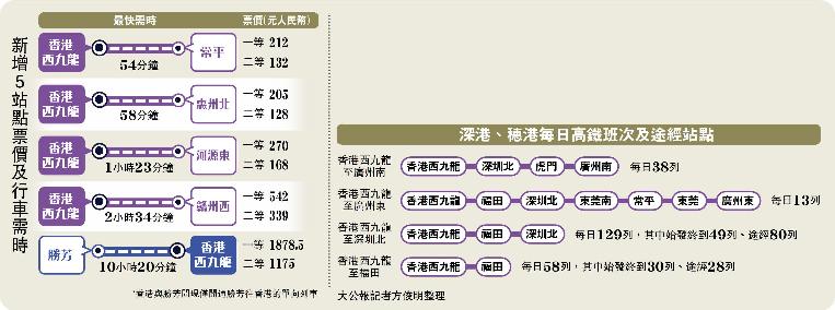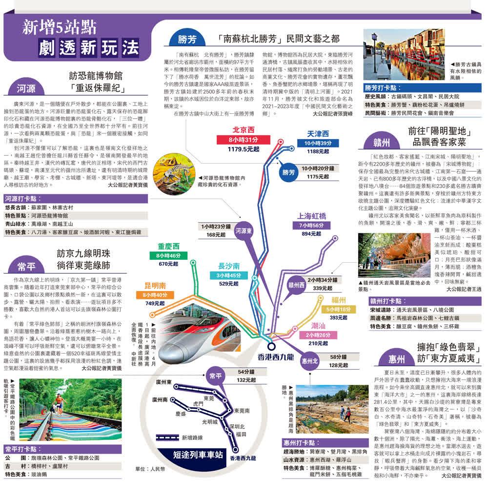 赴北京武漢潮汕桂林車票售罄 香港《大公報》報道,廣深港高鐵香港段從今日起全面恢復長途服務。據內地最新安排,由香港西九龍站往來上海虹橋的列車將採用新路線,途經惠州北、河源東及贛州西站,行車時間將縮短至約8小時。另外,每天有4班往來香港西九龍站至廣州東站的列車將不停東莞站,改為停靠新增的常平站。由天津西站至香港西九龍站的班次則將增停勝芳站。 4月1日當日,由香港西九龍出發前往北京、武漢、長沙、潮汕、桂林的車次所有坐席均已售罄,前往廈門的4班列車中,僅剩1班有餘票。 港鐵:料今日逾3萬乘客坐高鐵離港 港鐵表示,高鐵網絡覆蓋擴大至全國66個站點,列車班次增加至164班,大致回復至疫情前水平。高鐵自1月中及3月11日起先後重啟短途及廣東省長途列車服務,逐步有序全面復通,乘客量穩步上昇。港鐵預計,4月1日全日將有逾3萬名乘客乘搭高鐵離港,當天將於車站安排逾百名人手,加強車站指示以協助乘客出行。 此外,為便利粵港澳大灣區旅客往返粵港,記者從廣鐵集團獲悉,新的列車運行圖實施後,廣鐵也將優化部分廣州、深圳開往香港西九龍動車組列車的開行時間。其中,“香港西九龍─廣州東”增開1列動車組列車,共開行列車13列。而廣州南站往返香港西九龍站的列車由每天的28列增加至38列,增幅達35%。 便利兩地商業洽談產業合作 同時,深圳北站至香港西九龍站間列車共開行129列,其中始發終到49列、途經80列。福田站至香港西九龍站間列車共開行58列,始發終到30列、途經28列;深圳地區兩站開行跨境高鐵列車數較之前增加60列。廣鐵表示,往返香港高鐵運能進一步提升,將更好地滿足往來深港、穗港兩地以及全國重點城市與香港之間的人員流動和經貿需求。 隨著廣深港高鐵班次越織越密,讓粵港兩地重新回到一小時乃至半小時“灣區生活圈”。“往返深港、穗港高鐵運能大幅提升,對於粵港跨境商務出行是大利好的消息。”港青劉曉東告訴記者,近期北上廣州經常搭乘高鐵,由於較多在廣州珠江新城開展商務洽談,因此乘坐“香港西九龍─廣州東”,一個多小時就抵達廣州東站,再轉乘十多分鐘的地鐵就到了珠江新城。“4月1日起增開‘香港西九龍─廣州東’動車組列車,那就更加方便”。他還稱,隨著內地業務拓展,接下來將更多機會乘坐長途高鐵,譬如4月中旬將到武漢參觀合作企業的項目,到時可從香港搭高鐵直通武漢。 在廣東多地從事電子零件商貿的港人吳文熙表示,香港高鐵新增開往東莞常平、惠州乃至粵東北地區的河源等地,進一步加密了香港高鐵通達地區,亦拓展了香港的發展腹地,讓粵港之間的商業洽談與產業合作更加方便。 新增5站點劇透新玩法