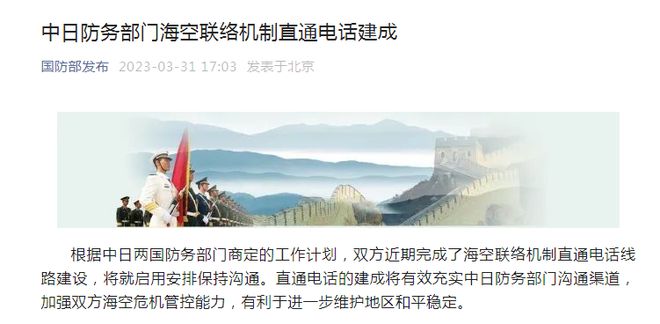 香港新聞網4月1日電 在日本外相林芳正4月1日訪華前一天,中國國防部發佈消息稱,中日防務部門海空聯絡機制直通電話線路建設完成。專家表示,這是一個中日關係正趨於改善的積極信號。