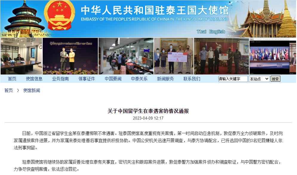 香港新聞網4月9日電 據中國駐泰國使館網站消息,日前,中國浙江省留學生金某在泰遭綁架不幸遇害。駐泰國使館高度重視有關案情,第一時間啟動應急機制,敦促泰方全力偵破案件,及時向家屬通報案件進展,並為家屬來泰處理善後事宜提供積極協助。中國公安機關迅速開展調查,與泰方協調配合,已將逃回中國的3名犯罪嫌疑人依法刑事拘留。