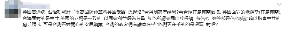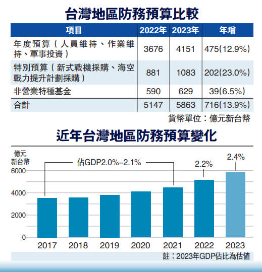 更有網友嗆,台當局不光窮兵黷武,還罔顧民生。台灣2023年度防務整體預算規模創歷史新高,達5863億元(新台幣),較2022年度增長716億元,增幅達到13.9%,占島內GDP比率約為2.4%。