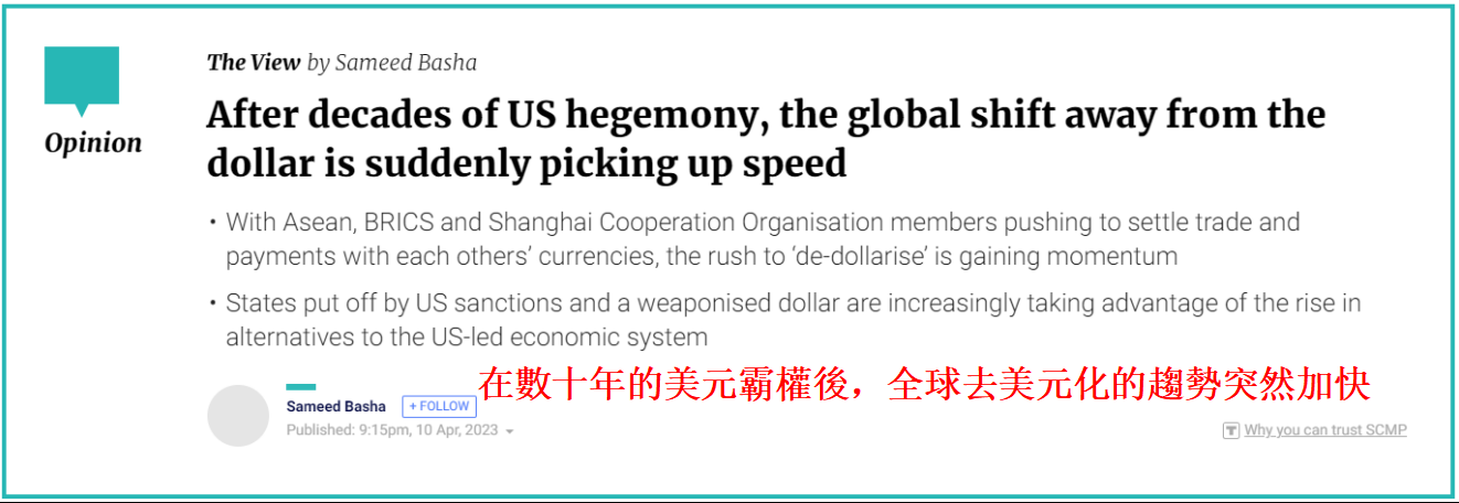 香港新聞網4月11日電 香港《南華早報》昨日(10日)發表題為《在數十年的美元霸權後,全球去美元化的趨勢突然加快》的文章。文章稱,在美元稱霸數十年後,全球“去美元化”的趨勢突然加快。美國對不同意其外交政策的國家過度使用“美元武器化”的制裁,使其它經濟體感到緊張和擔憂。作為對美元信心不足的表現,“去美元化”出現了前所未有的浪潮。