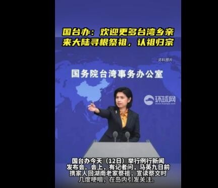 國台辦今天(12日)舉行例行新聞發佈會。會上,有記者問,馬英九日前攜家人回湖南老家祭祖,宣讀祭文時幾度哽咽,在島內引發關注。不少台灣網友表示,“游子歸鄉、思源念祖是道地的中華文化”,“祭拜祖先,不忘本,明年也要回鄉祭祖”。對此有何評論?