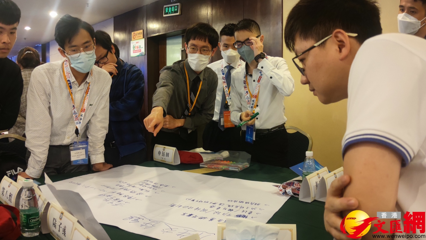 粵港教師積極參與討論。圖源:香港文匯網 在交流討論環節,香港和內地老師10多人一組,在一張大的白紙上寫下圍繞Chat-GPT討論的教案設計思路、關鍵詞,每個人都輪流表達自己的教案設計,大部分教師都站起來,一邊用馬克筆寫關鍵詞,一邊解釋設計理念,很有激情。現場除了粵語外,也有普通話的交流。記者看到,因有內地教師不懂粵語,香港年輕教師也用比較順暢的普通話來講解,照顧到每名教師,氣氛融洽。