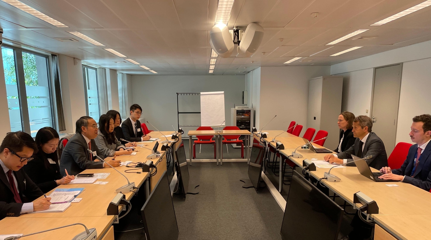 財經事務及庫務局局長許正宇(左三)昨日(布魯塞爾時間四月十四日)於比利時布魯塞爾與歐洲聯盟委員會稅務與海關同盟總司(直接税、稅務協調、經濟分析及評估)司長Benjamin Angel(右二)會面。政府新聞處圖片 此外,許正宇與歐洲聯盟委員會金融穩定、金融服務和資本市場聯盟副總幹事Alexandra Jour-Schroeder會面時,分享香港在促進金融科技以及綠色和可持續金融方面的努力,他並表示歐盟和香港都是發展相關領域的先驅。 許正宇亦與比利時金融服務及市場管理局副主席Annemie Rombouts會面。他們就各金融市場監管機構間日益重要的國際合作交換意見,且就如何有效監管並同時促進業務增長分享經驗。 許正宇禮節性拜會中國駐比利時王國大使曹忠明。他向曹忠明介紹香港為融入國家發展大局而不斷作出的努力。