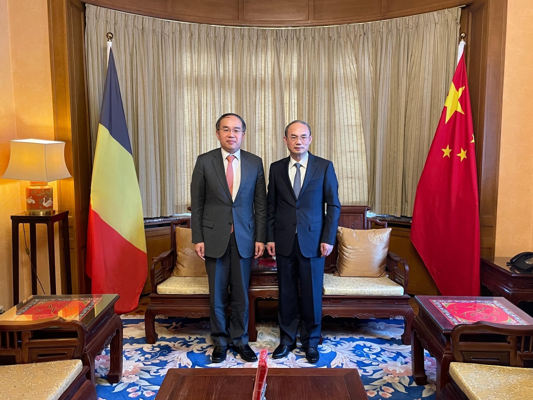 財經事務及庫務局局長許正宇(左)昨日(布魯塞爾時間四月十四日)於比利時布魯塞爾禮節性拜會中國駐比利時王國大使曹忠明(右)。政府新聞處圖片 布魯塞爾國際奇幻電影節香港電影之夜亦在昨日舉行。許正宇對首次參加該電影節表示高興,並在酒會上致歡迎辭。他指出,香港特區政府的優先工作之一是把香港發展成為中外文化藝術交流中心,大力支持創意產業,當然包括電影業。