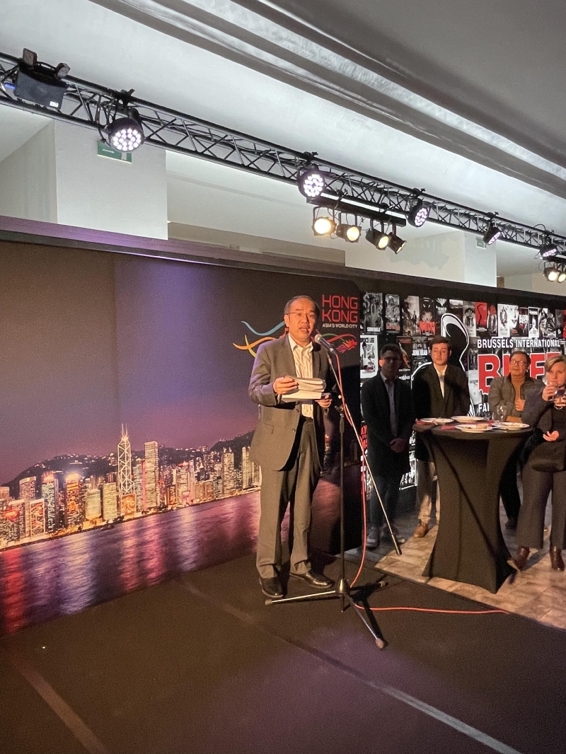 財經事務及庫務局局長許正宇昨日(布魯塞爾時間四月十四日)於比利時布魯塞爾出席布魯塞爾國際奇幻電影節香港電影之夜酒會時致歡迎辭。政府新聞處圖片 許正宇將於布魯塞爾時間4月15日參觀比利時第二大港口澤布呂赫,之後結束比利時的訪問行程。 【編輯:刘春】