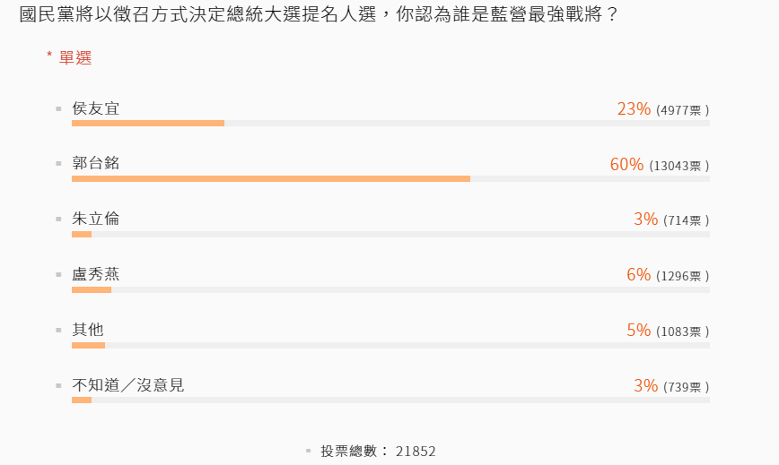 聯合新聞網民調結果。 在該則新聞結尾處,聯合新聞網特地製作一個線上投票專欄,請讀者選出心中的藍營最強戰將,結果2萬多名參加投票的網友中,60%認為郭台銘勝算更大。侯友宜目前得票率為23%,盧秀艷有6%得票率,朱立倫有3%得票率。(完) 【編輯:王軼南】