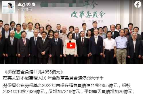 李彥秀社媒截圖 據中時新聞網消息,台灣勞保局日前在報告中指出,2022年未提取精算負債達11萬億4855億元,較2021年暴漲7216億元,平均每天增加20億元,而2021年較2020年的數據則是4763億元。 據報道,面對此番負債暴漲,有台灣相關官員表示,是由老年給付領取勞工和領取數額持續增加,以及勞保基金去年投資虧損等因素共同導致的。據統計,去年光老年給付就付出4292億元,占整體給付近9成。 報告出台後,台北市議員李彥秀坐不住了,今天(4月17日)直接在社交媒體上炮轟民進黨當局。 李彥秀質問,平均每天負債增加20億元是什麽概念?就是台灣人民不分年齡,每天只要睜開眼睛,每人平均又增加100元勞保負債,且光是勞保基金一項,每人平均就負債高達新台幣50萬元! 李彥秀還表示,台灣“勞動部”的預算案規模已接近2000億元,可能成為當局預算規模第四大的部門,而且今年已撥補的1170億、再加上特別預算300億及明年擬撥補的1000億,撥補預算就已經達到2470億元。 面對這個越來越大的債務黑洞,民進黨當局似乎沒有什麽辦法,只能得過且過地拖延著。