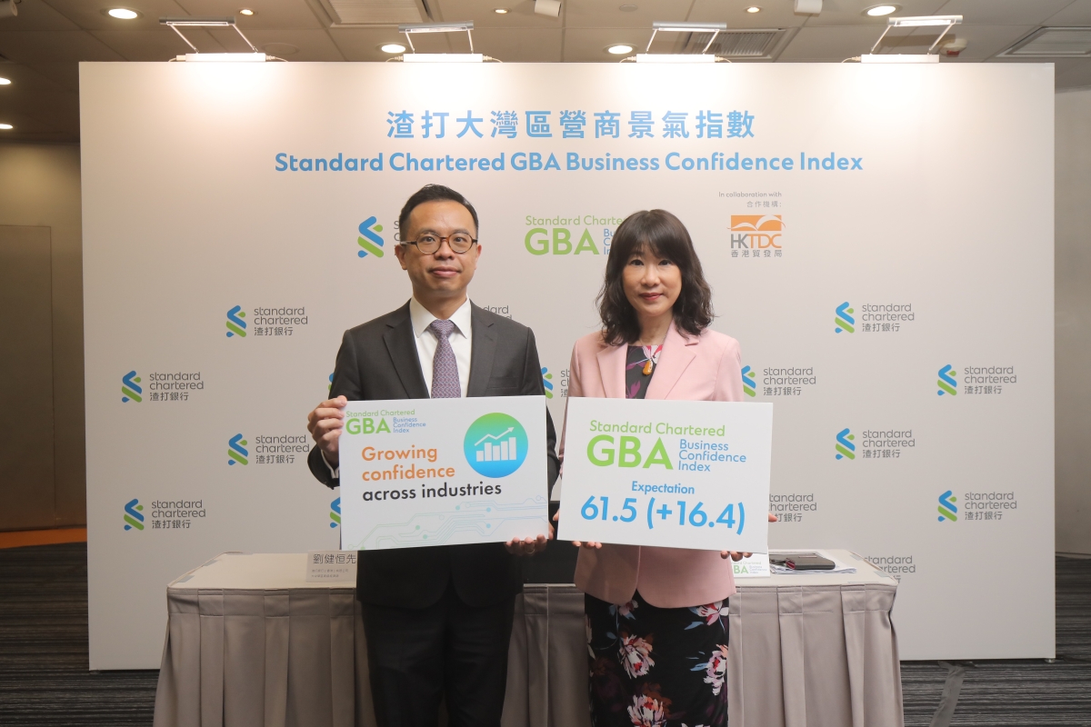 渣打大中華區高級經濟師劉健恒(左)及香港貿發局研究總監范婉兒(右)於記者會上公佈最新一季“渣打大灣區營商景氣指數”。 各行業子指數全面回升 各行業的“現狀指數”及“預期指數”全線錄得增長,“金融服務”(59.8)和“創新和技術”(54.3)的“現狀指數”表現最佳;而“預期指數”則以“專業服務”(65.2,升19.1點) 、“製造與貿易”(61.3,升17點)和“金融服務”(67.4,升16.9點)的升幅最為顯著。 東莞、廣州、深圳最為樂觀 各城市的“現狀指數”及“預期指數”亦全面回升,當中佛山(55.1)、東莞(53.5)和香港(51.6)在“現狀指數”表現較佳;而“預期指數”,則以東莞(69.6,升32.5 點)、廣州(67.7,升 24.6 點)和深圳(60.8,升13.7點)的升幅最為強勁。 內地經濟復蘇勢頭持續 渣打大中華區高級經濟師劉健恒表示,內地於年初對外開放,社區迅速建立群體免疫, 以致經濟活動急速復蘇,大灣區內企業的營商信心於今年首季已明顯改善,相關指數大幅反彈。預期在內地各項政策的支持以及全面通關的推動下,內地經濟復蘇勢頭有望持續。 現時不少企業的營運仍未回復疫情前水平,我們亦因此相信,大灣區有足夠的空間迎頭趕上,回歸正軌。