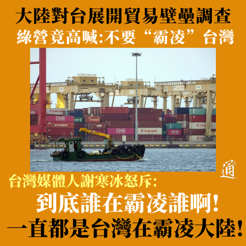 香港新聞網4月18日電 中國商務部早前宣布啟動台灣對大陸的貿易壁壘調查,涉及2455項產品後,有綠營人士竟召開記者會呼籲中國大陸不要“霸凌”台灣。對此,台灣媒體人謝寒冰直斥有關言論荒謬,直言“到底是誰在霸凌誰啊?一直都是台灣在霸凌大陸,不是嗎!”。