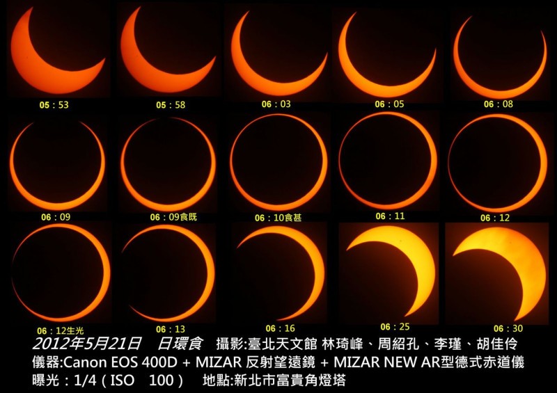 圖為2012年5月21日台灣新北市拍攝的日全環食。台北市立天文館資料圖 4月20日天宇將上演一次比較特殊的日食——日全環食,中國海南、廣東、福建、台灣等極少數地區可見食分極小的日偏食。 日食,又叫日蝕,在月球運行至太陽與地球之間并在一條直線上時發生。這時對地球上的部分地區來說,月球位於太陽正前方,來自太陽的部分或全部光線被遮擋住,因此看起來好像是太陽的一部分或全部消失了。日全食、日環食和日偏食是公眾所熟知的三種類型。 據瞭解,同一次日食,如果一部分地區可見日全食,另一部分地區可見日環食,則稱日全環食,又稱“混合食”“複合食”,非常罕見。以21世紀為例,這100年中僅有7次日全環食發生。 今年這次日食的食帶很窄,在食帶內兩端會發生日環食,在中間是日全食。日食帶從印度洋南部開始,經過澳大利亞的埃克斯茅斯、東帝汶東南部,印度尼西亞的巴布亞省,在太平洋西部結束。 本次日食,不論是全食階段還是環食階段,食分都非常接近1(也就是月亮正好剛剛遮擋住太陽表面,大小相差無幾),這不僅會帶來觀感上非常壯觀的景象,而且也是天文學家觀測太陽表面活動極其難得的機會。 比較遺憾的是,中國只有極少數地區能看到被月亮“吃了”一個小邊的日偏食,這些地區僅限於極東南的陸地和島嶼,包括浙江、福建、廣東的沿海地區,海南、香港、澳門、台灣、東海和南海等極少數地區。(完) 【編輯:許豐悅】