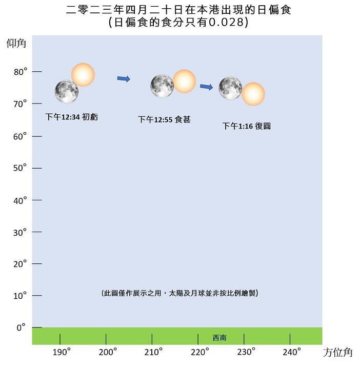 香港新聞網4月20日電 香港今日(20日)將出現日偏食。香港天文台表示,日食在中午12時34分開始,至下午1時16分結束,食甚時間為中午12時55分。此次日偏食的食分只有 0.028,即是在食甚時,太陽只有百分之2.8的直徑會受月球阻擋。 日偏食的詳情見下表: