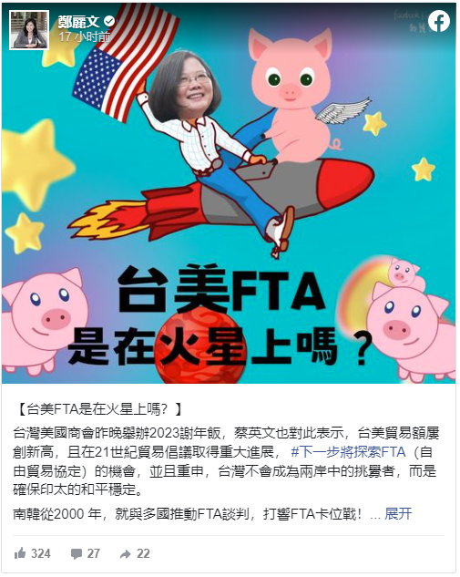 萊豬吃了3年!台當局才和美國談FTA香港新聞網4月21日電 台灣美國商會4月19日舉辦2023謝年飯,台灣地區領導人蔡英文表示台美貿易額屢創新高,且在21世紀貿易倡議取得重大進展,下一步將探索FTA(自由貿易協定)的機會。對此,國民黨立委鄭麗文4月20日發文質疑,韓國都和美國簽訂多久的FTA了,台灣到現在才要開始探索機會?那還要等到什麼時候才會簽定、生效?台美FTA是在火星上嗎?2016年蔡政府執政後,整整過了8年,到2023年才站到起跑線上?開放萊豬已經過3年了,還有誰要相信?