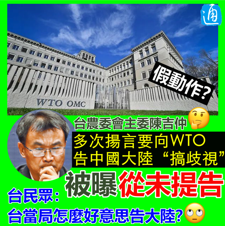 圖片製作:汪彥希 對此,中國國民黨“立委”王鴻薇4月20日質詢時揭露,台行政機構經貿談判辦公室網站上公告,至今台灣地區以原告身份向WTO提出的控訴案件中,台農委會一件都沒有。這意味著,陳吉仲之前的“義正嚴詞”都是假動作;王鴻薇狠批台農委會及陳吉仲在欺騙台灣民眾,要是不被發現,將一直騙。 根據台媒報道,王鴻薇質詢相關機構代表楊珍妮,台經貿談判辦公室提出的書面報告指出,台灣地區於WTO以原告身分提出控訴的案件共有7件,是否有任何對中國大陸提出的控訴?是否有農委會提出的控訴? 楊珍妮均表示沒有對中國大陸提出的控訴,亦沒有接到農委會要求向WTO提出控訴。這證實了農委會過去對外界說要對中國大陸禁止台灣農產品向WTO提告,根本就是謊言,甚至連第一步向上級申請,都未有動作。 事實上,台農委會對於禁止向大陸輸入加工類食品、水產品等提出的都是“特別貿易關切”,從未向WTO提出訴訟,根據資料顯示,該地區在WTO提出訴訟7宗案件,有3件對印度,1件對美國,1件對加拿大,1件對印尼,1件對歐盟。 事實上,台當局理不直氣也不足,一些政客心知肚明,說要“告到WTO去”無非是在做“大內宣”。據悉,中國大陸有關主管部門根據世貿組織(WTO)有關規則進行了通報,提交了《進口食品境外生產企業註册管理規定》并於2021年10月向台方通報了有關事項和要求。 陸方對台灣食品企業提出的註册申請,有關主管部門及時予以審核,對符合要求的申請及時予以註册,對不符合要求的申請亦逐一告知具體原因,并將相關企業補充提交註册信息的期限由2022年6月30日延長至8月31日;從2021年4月至2022年8月,有充足時間妥善處理台灣食品企業相關註册事宜,部分台灣食品企業註册信息不完整、不規範的問題也并不難解決。 台當局不及時向相關食品企業提供協助反而將食品安全監管污衊為“歧視待遇”等,故意挑起兩岸爭端,又將此事刻意潑上了“政治髒水”實在是令人咋舌。 台灣民眾亦怒斥台當局“無論是缺蛋、缺電、缺水還是貿易,台當局第一件事不是想解決,而是想著怎麼去騙民眾!” 更有台網友直言“意外嗎?台灣禁大陸幾千項誒,所以怎麼敢告?”“民進黨是台灣經濟的破壞者。” 【編輯:汪彥希】