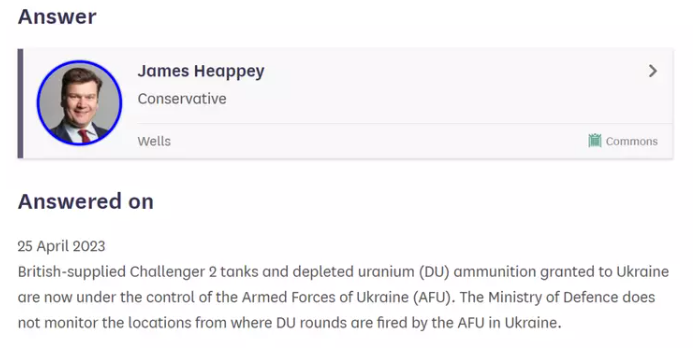 希佩回答截圖。 俄羅斯駐英大使館批評,西方不但把烏克蘭變成反俄的軍事靶場,更準備變成放射性廢物埋葬場,將對居民健康及區內環境帶來嚴重後果。聲明強調,英方需對有毒彈藥的影響負責,不能透過交予烏軍來撇清責任。