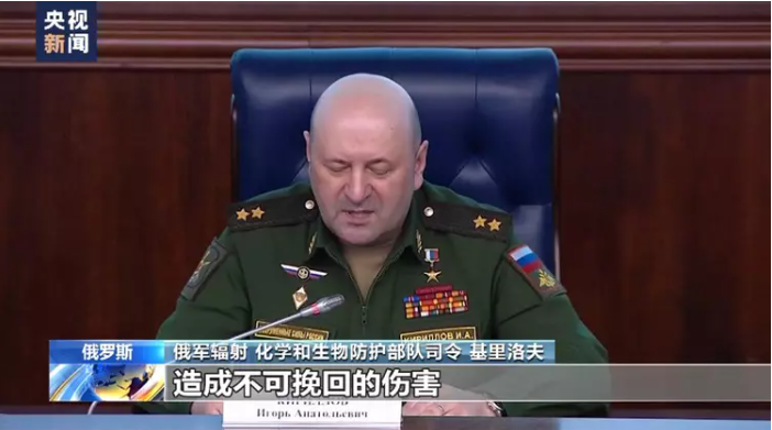 俄軍輻射、化學和生物防護部隊司令解釋貧鈾彈危害。央視截圖 俄軍輻射、化學和生物防護部隊司令基里洛夫向媒體表示,如果烏克蘭使用貧鈾彈,將對烏克蘭軍人的身體造成不可逆轉的損傷,還將對烏克蘭農業出口造成數十年甚至上百年的影響。