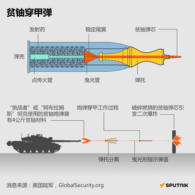 貧鈾彈穿甲原理。製圖:俄羅斯衛星通訊社 貧鈾彈是指以含有鈾238的硬質合金為主要原料製成的炮彈和槍彈。其作用原理跟普通穿甲彈相同,是利用貧鈾合金的高硬度、高比重和高熔點依靠動能來穿透目標,其多用來毀傷坦克等裝甲目標。 但貧鈾也是一種危害人體健康的放射性物質,歷史上,以美國為首的北約曾多次對別的國家使用貧鈾彈,給當地民眾帶來的災難延續至今。多個國家及國際組織一直以來都呼籲謹慎使用甚至禁止使用貧鈾武器。 另據報道,俄羅斯已經幫助白俄羅斯重新裝備了10架能攜帶戰術核武器的戰機,俄方已將一定數量的可以攜帶戰術核彈頭的伊斯坎德爾導彈系統轉移到白俄羅斯。俄羅斯已從4月3日開始訓練白俄羅斯相關人員,7月1日前會在白俄羅斯完成戰術核武器的儲存設施建設。 這將是俄羅斯自20世紀90年代中期以來首次在國外部署此類武器。有分析認為普京此舉是作為對英國向烏克蘭提供貧鈾彈的反擊。(完) 【編輯:王軼南】