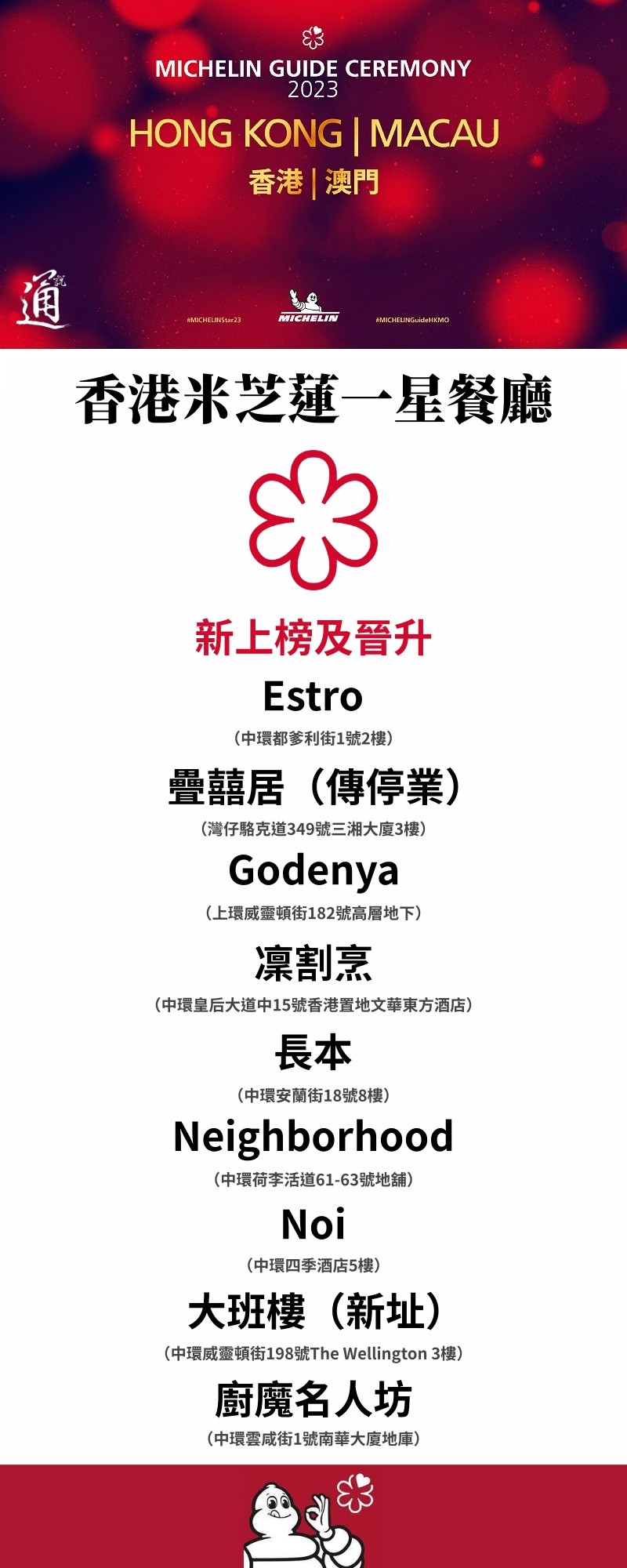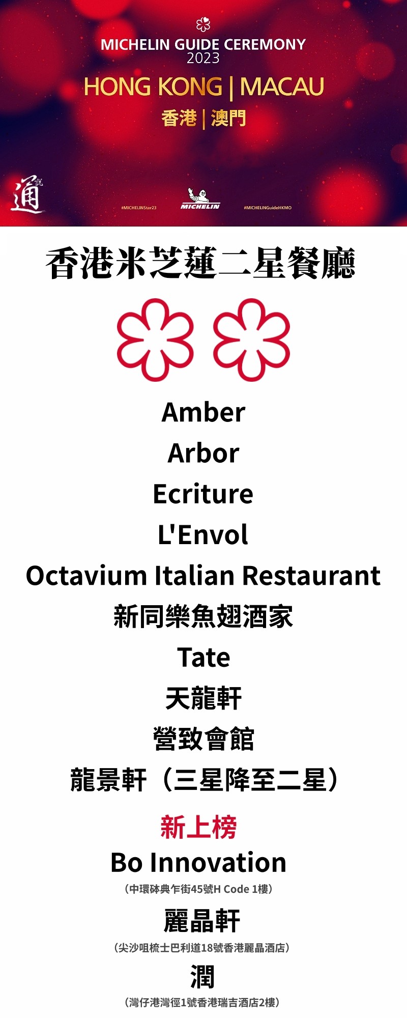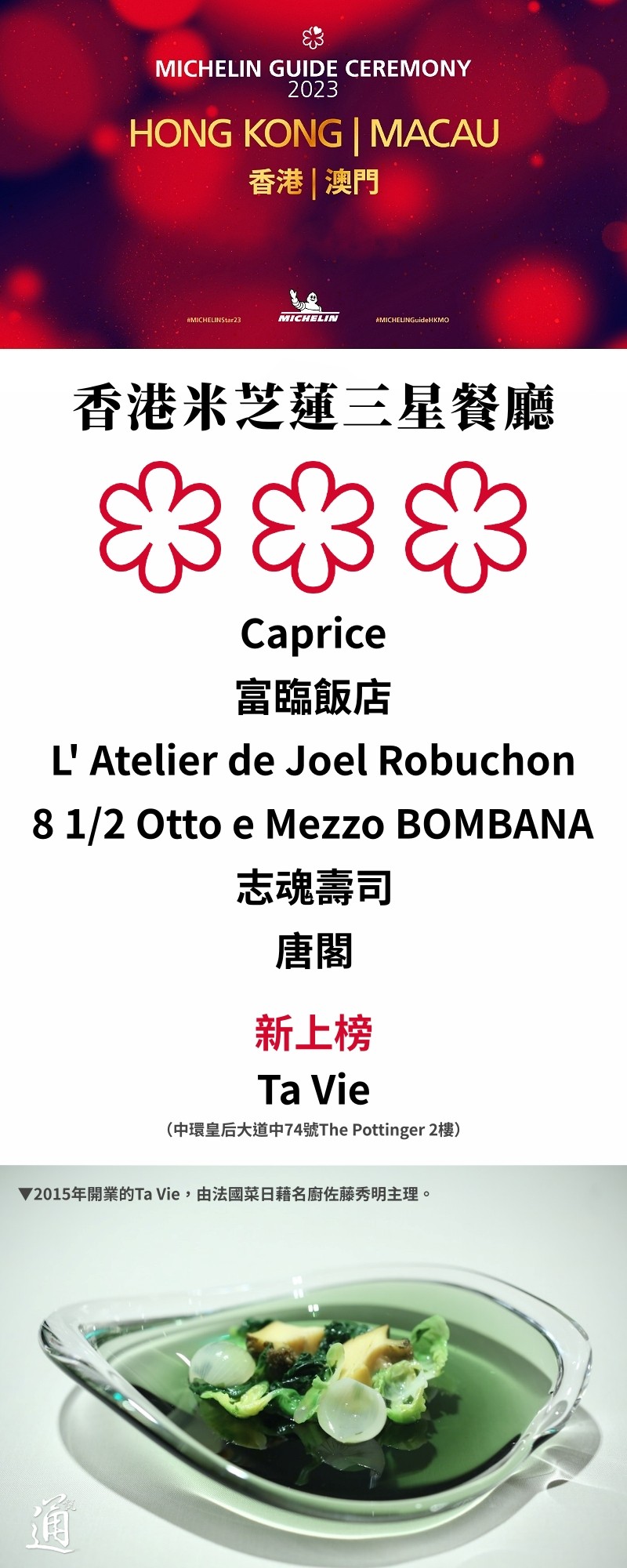 香港新聞網4月27日電 第15屆《香港澳門米芝蓮指南2023》於4月26日回歸實體形式並於澳門新葡京酒店舉行頒獎禮。今年香港共有78家餐廳獲三星、二星及一星,當中有9間餐廳新上榜或晉升一星,3間新上榜二星,最驚喜的是由法國菜日藉名廚佐藤秀明主理的Ta Vie(旅)首次摘得三星。有人歡喜有人失望,全球首間及連續14年奪得米芝蓮三星中菜餐廳龍景軒今年則降級至二星。 而第三年登場的“米芝蓮綠星”奬,除了由澳門旅遊學院教學餐廳、香港Roganic和Amber蟬聯之外,由劉韻棋(Vicky Lau)創辦的中法特色餐廳Mora(摩),也首度入選。 今年米芝蓮新增三項特別獎項,以表揚餐飲業的專業人才。“侍酒師大獎”得奬者為香港米芝蓮三星餐廳富臨飯店的Jacky Luk(陸志文); “年輕主廚大獎”為香港米芝蓮一星餐廳Hansik Goo的主廚Steve Lee。“服務大獎”獲獎者為澳門二星餐廳川江月的Kit Li(黎佳寧)。 不過,在昨日公布的名單中,香港“疊囍居”入選為一星餐廳,卻缺席頒獎禮,未有人到場領獎,同日亦傳出停業消息。有疊囍居員工向傳媒報料,指酒家欠所有樓面員工每人約2個月或更多個月份薪金。酒樓今日未對外營業,“疊囍居”的招牌亦已被拆下。 大會在早前已公布必比登餐廳名單,必比登推薦的餐廳小店,都是大家可以HK$400品嚐到三道菜式美食,這些小店水準不單能達至色、香、味俱全,而且價格親民,絕對物有所值。今年香港《香港澳門米芝蓮指南2023》必比登共有72間店入選,香港佔有65間,當中6家是首次上榜的餐廳及街頭美食。