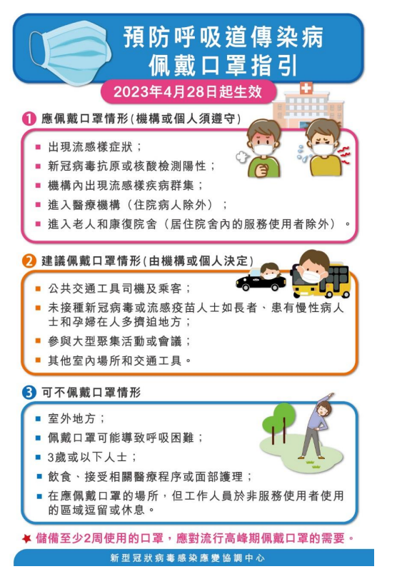 澳門新型冠狀病毒感染應變協調中心圖片。 市民若出現發熱、肌痛、咽痛、咳嗽、流涕等流感樣症狀、以及新冠病毒抗原或核酸檢測陽性時,均屬於“應佩戴口罩”。另外,工作場所、托兒所及非高等教育機構出現流感樣疾病群集時;進入醫療機構(住院病人除外)及老人和康復院舍(居住在院舍內的服務使用者除外),亦應佩戴口罩。當局根據傳染病疫情作出要求的其他情形。 至於“建議佩戴口罩”的情形包括公共交通工具的司機及乘客;未接種新冠病毒疫苗或流感疫苗人士、長者、患有慢性病人士和孕婦在人多擠迫的地方,尤其是新冠病毒或流感病毒傳播水平較高時;參與大型聚集活動或會議尤其是人員來源廣泛、流動性較大時;其他室內場所和交通工具。應變協調中心指出,這些情形下,由場所或交通工具的主管實體參考當時疫情、空間內空氣流通情況、人員數量和密度、活動性質和持續時間等,決定是否要求進入者佩戴口罩。 而所有室外地方;佩戴口罩可能導致呼吸困難時3歲或以下人士;飲食、接受相關醫療程序或面部護理時;在應佩戴口罩的場所,但工作人員於非服務使用者使用的區域逗留或休息時,市民可不佩戴口罩。 應變協調中心強調,若疫情出現變化,會按實際情況調整佩戴口罩要求。居民日常外出時應備有口罩,以便有需要時佩戴。居民須在家中儲備至少兩周使用的口罩,以應對新型冠狀病毒感染和其他呼吸道傳染病流行高峰期佩戴口罩的需要。(完) 【編輯:孟宜君】