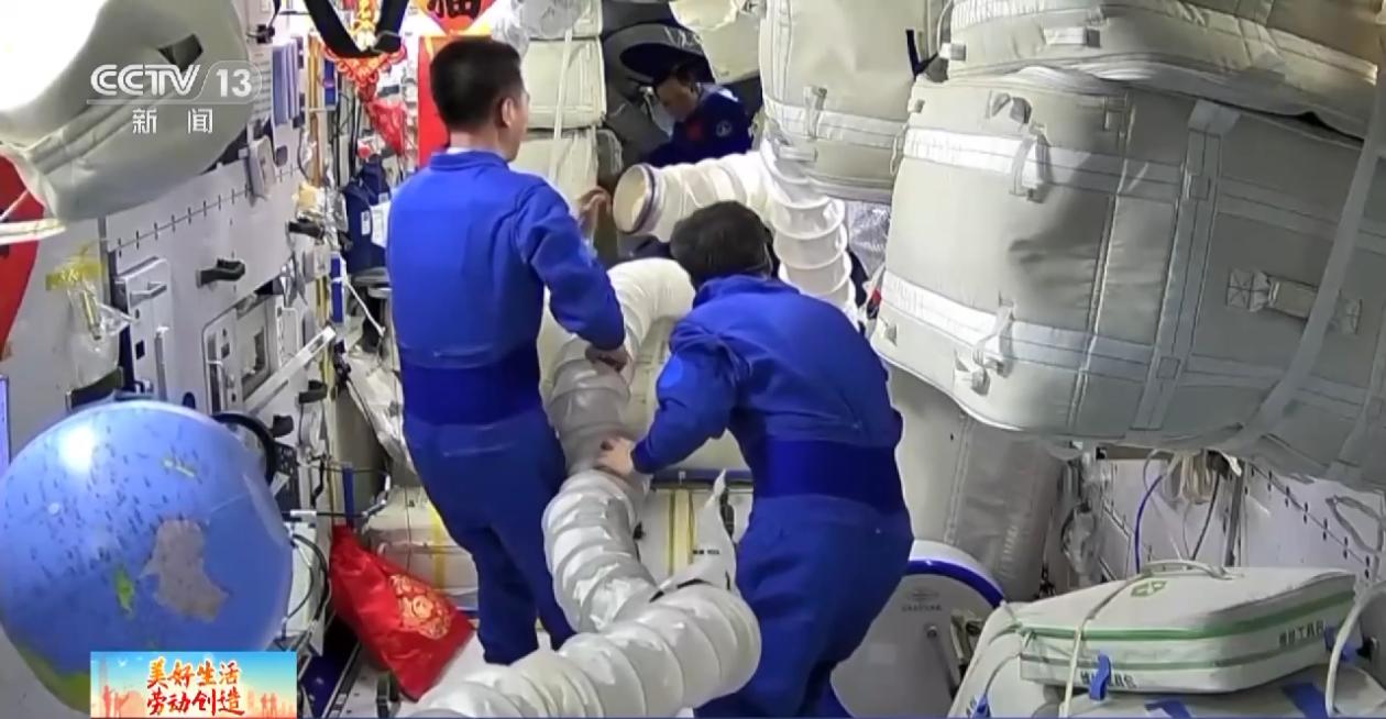 航天員所需的食物、水、實驗設備等物資都是裝在貨運飛船的貨物艙裡,快遞到空間站的,航天員通過貨運飛船與空間站的對接口進入貨運飛船。