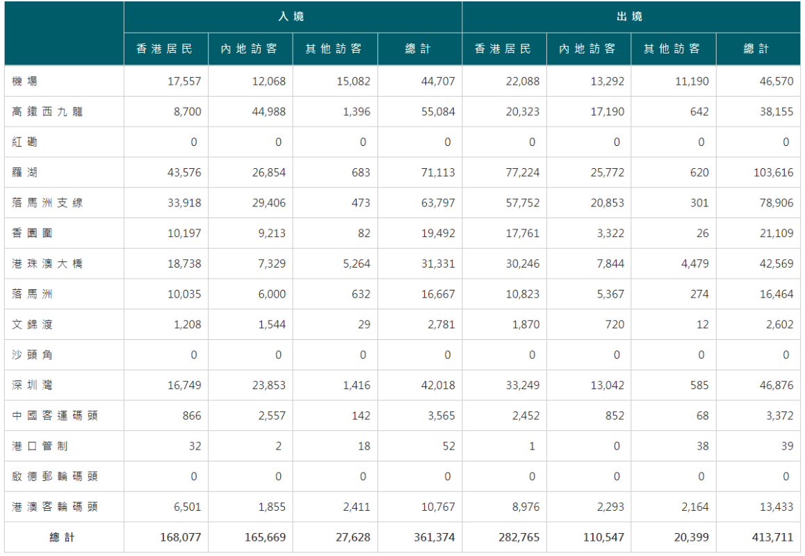 香港入境事務處官網截圖 香港入境處在五一長假首日(4月29日)共錄得約36萬1374人次入境,其中16萬5669人次為內地訪客。入境處星期天(4月30日)共錄得約40萬6614人次入境,其中15萬6313人次為內地訪客,相較於五一長假首日,中國大陸訪客數量略減約9000人次,但仍是自2月6日大陸與香港全面通關之後單日第二高。 在這15.6萬人次的中國大陸訪客中,透過高鐵西九龍站赴港的人次最多,達到3萬6327人次,其次是福田口岸(落馬洲支線),共有3萬2651人次入境。 旅行團方面,截至4月30下午5時,香港旅遊業監管局共接獲636個內地入境旅行團登記在勞動節假期,即4月29日至5月3日期間訪港,涉及內地旅客約2萬人次。(完) 【編輯:王軼南】