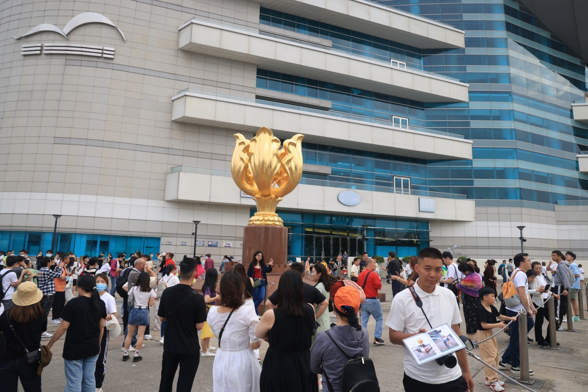 5月1日,香港全面復常後大批遊客遊覽香港金紫荊廣場。香港中通社圖片 內地游客佔五一長假期間香港入境人員的約三分之一,刷新了陸港全面通關以來的單日新高。