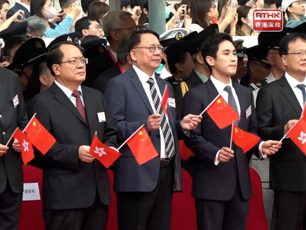 政務司司長陳國基、中聯辦副主任陳冬等擔任主禮嘉賓。圖源:香港電台 政務司司長陳國基、中聯辦副主任陳冬、外交部駐港特派員公署以及駐港部隊代表等擔任主禮嘉賓。保安局局長鄧炳強、民政及青年事務局局長麥美娟、立法會主席梁君彥等人出席。 今年的昇旗禮是新冠疫情3年後首次復辦,參與活動的制服團隊全部以中式步操列隊,並配以銀樂隊奏樂進場,現場有大批小學生參與觀禮。 香港各界青年活動委員會邀請19隊青年制服團隊,共1500名學生到場觀看昇旗禮。代表宣讀五四宣言,全體制服隊伍首次以中式步操列隊進場。 (完) 【編輯:王軼南】
