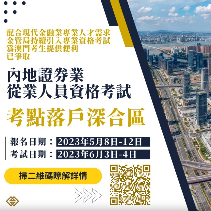 內地證券業從業人員資格考試落戶深合區。 內地證券資格考試設點深合區為澳門考生提供便利 按中國證券監督管理委員會的證券業從業人員資格管理辦法,從業人員必須先通過“證券業從業人員資格考試”,並透過內地的聘用機構註冊從業資格後,方可從事相關證券業務。中國證監會並指定中國證券業協會負責組織這項資格考試。 相關專業資格在深合區的落地,將為澳門考生提供便利,為澳門金融人員於深合區從事金融業務創設條件,有助提升金融從業員的專業水平,促進澳門及深合區現代金融業的聯動發展。 持續引入專業資格考試提升居民競爭力 澳門金管局透過澳門金融學會,陸續引入國際及國家認可的金融專業資格考試,除是次引入的“證券業從業人員資格考試”外,還包括香港的“銀行專業會士”及“證券及期貨從業員資格考試”、“認可財務策劃師”、“認證財務顧問師”、“深港澳金融科技師”專才計劃等金融專業資格考試,便利居民透過考取專業資格,提高專業水平及競爭力。 澳門金管局將透過澳門金融學會,結合專業培訓機構和高等院校資源,陸續開辦相關專業資格考試的備考課程,協助澳門居民考取相關專業資格。 (完) 【編輯:黃璇】