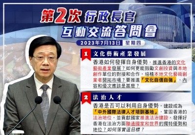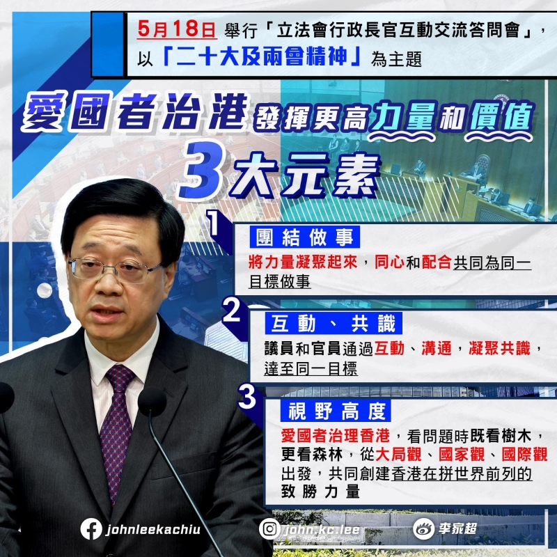 他續說,議員在會上可就議題向行政長官提問,亦可表達意見。行政長官除了回答問題外,亦可諮詢議員意見,以納入施政考慮。 李家超又提及,“前廳交流會”開啟了行政立法良性互動新篇章,形容效果正面。再加上與80多名議員訪問大灣區,規模是史無前例,行政立法前所未有打成一片。他認為,“愛國者治港”要發揮更高的價值和力量,政府和立法會要團結做事,凝聚共識,並要有大局觀、國家觀和國際觀的視野高度。 李家超隨後在社交平台發文,指下周四(5月18日)我將會到立法會出席首次舉行的“互動交流答問會”,並以“二十大及兩會精神”為主題,讓大家討論香港的施政方向和目標。相信“互動交流答問會”,能進一步提升與立法會議員互動交流,釋放和提升更多愛國者治港的力量和價值,促進愛國者團結做事,從大局視野互動交流、建立共識,共建香港。(完) 【編輯:孟宜君】
