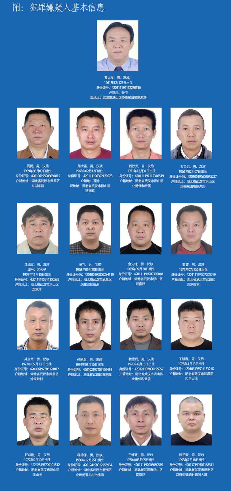 香港新聞網5月9日電 湖北省黃岡市公安局日前發布通告,指破獲了一個武漢黑幫團夥,拘捕17名疑犯。當中包括坊間傳聞盤踞湖北武漢多年的“黑幫老大”黃大發、熊大喜,二人均為“香港籍”。 現年61歲的黃大發曾任武漢市洪山鄉井崗山村黨委書記、武漢江宏集團董事長,而該集團現時已經注銷。他與60歲的熊大喜的戶籍地均顯示為香港,報稱居住地則為武漢市。據報,黃大發涉及多宗暴力拆遷事件,他利用城中村改造機會,長年“統治”武漢長江以北所有的樓盤物業,是盤踞當地多年的“黑社會老大”。