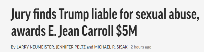 美聯社報道截圖 不過,陪審團沒有認定特朗普犯有強奸罪,而是認定他犯有性虐待和誹謗罪。對此,特朗普在自創社交平台發文否認,并稱這一裁決為“恥辱”和“政治迫害”。特朗普的律師表示將會上訴。