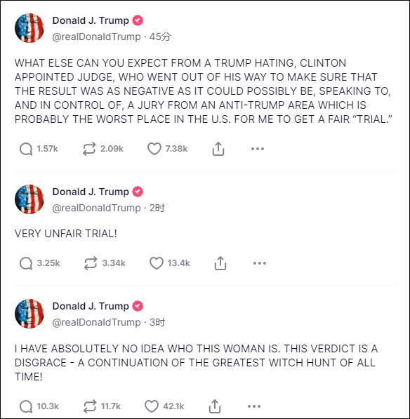 特朗普發文稱裁決為“恥辱”和“政治迫害”,社交媒體截圖 據美聯社、路透社報道,在庭審中,現年79歲的卡羅爾作證說,特朗普“於1995年或1996年”在曼哈頓一家百貨公司的更衣室強奸了她。據卡羅爾所說,特朗普當時以“幫助另一個女人挑選衣服”為由,將她騙到更衣室,隨後對她進行“強奸”。她還說,由於時間過於久遠,她不記得事情發生的確切日期或年份。 特朗普并未在庭審中現身,但曾於去年的一段證詞中說他將卡羅爾誤認為是他的前妻,還說卡羅爾“不是我喜歡的類型”。特朗普的法律團隊在庭審中抨擊了卡羅爾說法的可信性,質疑她為什麼從未向警方報案,也沒有在“強奸”事件中尖叫。 卡羅爾的兩名朋友辯稱,卡羅爾在事發後告訴了他們,但讓他們保密,因為她擔心特朗普會進行報複。卡羅爾表示,在好萊塢製片人哈維·韋恩斯坦性侵事件曝光後,她決定在2017年打破沉默。 卡羅爾還說,特朗普於2022年10月在自創社交平台“真相社交”發文公開否認此事,將此事描述為“民主黨的陰謀”,這毀了她的職業生涯,并引發了他的支持者在網上對她進行惡毒騷擾。