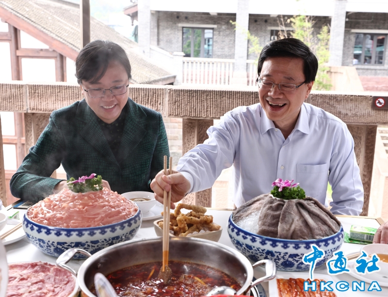 •   5月11日,香港特區行政長官李家超繼續在重慶的訪問行程。圖為李家超到磁器口歷史街區的一家火鍋店,品嘗重慶麻辣火鍋。 香港中通社圖片