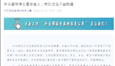 針對美國國會及行政當局中國委員會發表所謂“報告”,肆意抹黑香港國安法和特區司法制度,叫囂對香港國安法法官實施無理制裁,外交部駐港公署發言人表示強烈譴責和堅決反對。 發言人指出,司法機構、法官與司法人員獨立且不受干預地行使司法權力,是全球法治社會的基石,更是香港法治的名片。香港國安法“一法定香江”,讓香港重回海晏河清,法治正義得到伸張,廣大香港居民依法享有的各項權利自由得到更好保障。特區司法機關和法官依照法律規定、根據法定職權、遵循法定程序秉公獨立辦案,盡忠職守,天經地義。