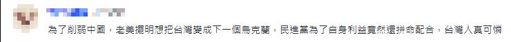 “為了削弱中國,美國擺明想把台灣變成下一個烏克蘭,民進黨為了自身利益竟然還拼命配合,台灣人真可憐”。