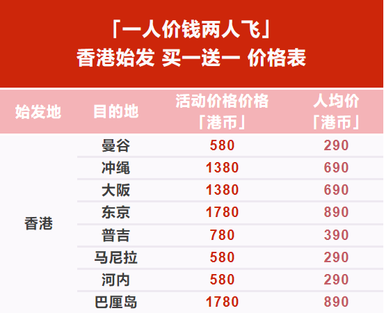 香港航空買一送一限時活動,一人價格兩人飛分享到: