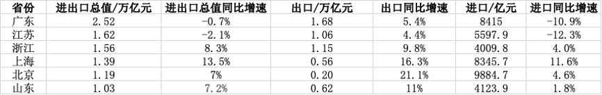 中國四省兩市2023年1-4月進出口數據 四省兩市進出口總值均突破萬億 中國四省兩市進出口總值從高到低依次為廣東、江蘇、浙江、上海、北京、山東。 中國外貿第一大省廣東今年1-4月進出口2.52萬億元,同比下降0.7%。其中,出口1.68萬億元,增長5.4%;進口8415億元,下降10.9%。中國海關總署廣東分署方面表示,整體數據微降,是受到海外需求走弱、高基數等影響。 另外兩個外貿大省江蘇、浙江數據顯示外貿回暖。 前4月,江蘇、浙江進出口分別為1.62萬億元、1.56萬億元,增速分別為-2.1%、8.3%,從增速看,兩省前4月數據比一季度回暖——江蘇降幅收窄、浙江增速加快(一季度,江蘇、浙江進出口增速分別為-6.7%、4.8%)。分開看,江蘇出口1.06萬億元,增長4.4%,進口5597.9億元,下降12.3%;浙江出口達1.15萬億元,同比增長9.8%;進口4009.8億元,同比增長4.0%。其中,江蘇出口創同期歷史新高。 需注意的是,浙江外貿表現良好,在前三外貿大省中,浙江是唯一一個進出口總值、進口、出口均實現正增長的省份。 上海、北京今年1-4月進出口總值分別為1.39萬億元、1.19萬億元,增速分別為13.5%、7%;其中,上海出口5586.5億元,增長16.3%,進口8345.7億元,增長11.6%;北京進口9884.7億元,增長4.6%,出口1984.8億元,增長21.1%。從增速看,上海、北京的進出口總值、進口、出口增速均高於全國水平。 上海海關指出,上海4月份進出口恢複至2021年同期水平。數據顯示,4月份,上海市進出口3466.3億元,同比增長57.9%,比2021年同期增長0.4%。 此外,山東省1-4月進出口1.03萬億元,同比增長7.2%。其中,出口6214億元,增長11%;進口4123.9億元,增長1.8%。進出口、出口、進口增速均高於全國水平。 計算發現,中國四省兩市前4月進出口總值合計約達9.31萬億元,占全國(13.32萬億元)比重接近七成,體現幾大外貿強省的實力。 民營企業新興市場占比明顯提升 從中國六省市數據看,民營企業對外貿的拉動作用明顯。 比如,廣東民營企業保持第一大外貿經營主體地位。1-4月,該省民營企業進出口1.53萬億元,增長6.5%,占進出口總值的60.5%,比重提升4.1個百分點。 江蘇1-4月民營企業進出口6930.7億元,增長13.3%,比重同比提升5.8個百分點至42.8%,拉動全省進出口增長4.9個百分點。 浙江1-4月民營企業進出口1.24萬億元,同比增長12.7%,占全省外貿總值的80.0%,拉動全省進出口增長9.7個百分點。 山東1-4月民營企業進出口7665.8億元,增長10.4%,占全省進出口總值的74.2%,占比提升2.2個百分點。 從全中國來看,前4月,民營企業進出口7.05萬億元,增長15.8%,占中國外貿總值的52.9%,比2022年同期提升4.6個百分點。 新興市場占外貿的比重也在提升。如,前4月,廣東對東盟進出口增長7.8%;對“一帶一路”沿線國家進出口增長9.8%,占進出口總值的29.3%;對RCEP其他成員國進出口增長0.7%。 浙江1-4月對東盟、中東、拉美和非洲分別進出口2227.2億元、1797.6億元、1539.1億元和1219.4億元,分別同比增長17.7%、12.8%、17.4%和30.8%,合計占全省進出口總值的43.6%,拉動全省外貿增速7.3個百分點。 山東前4月對東盟進出口1979.1億元,增長19.2%,對“一帶一路”沿線國家進出口4227.2億元,增長23.2%,占全省進出口總值的40.9%,占比提升5.3個百分點;對RCEP其他成員國進出口3931.1億元,增長11.2%,占進出口總值的38%,占比提升1.4個百分點。 此外,“新三樣”出口顯著增長,尤其以廣東、上海錶現亮眼。上海電動載人汽車、鋰電池、太陽能電池“新三樣”出口分別增長153.5%、274%、92.2%;廣東分別增長9.5倍、35.4%、102.4%。(完) 【編輯:許豐悅】