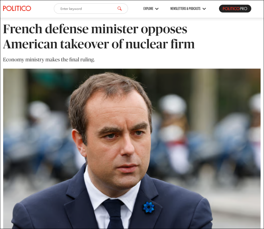 “政客新聞網”歐洲版報道截圖。圖源:觀察者網 據“政客新聞網”歐洲版當地時間5月24日報道,法國國防部長塞巴斯蒂安·勒科爾尼23日晚間表態稱,他將會反對福斯這筆涉及到希高的收購案。 報道稱,雖然法國國防部參與決策,但此事的最終決定權歸於法國經濟部。相比於勒科爾尼的強硬態度,法國經濟部方面目前拒絕對未來事態發展置評,儘證實“外國投資審查程序正在進行中”,尚未做出任何決定。 總部位於法國的希高公司,以生產核鍋爐房閥門系統而享譽世界,可為核電站、核動力艦艇以及裝備核動力彈道導彈潛艇提供安全系統。該公司也為法國所有核潛艇和戴高樂號航空母艦提供核蒸汽系統。