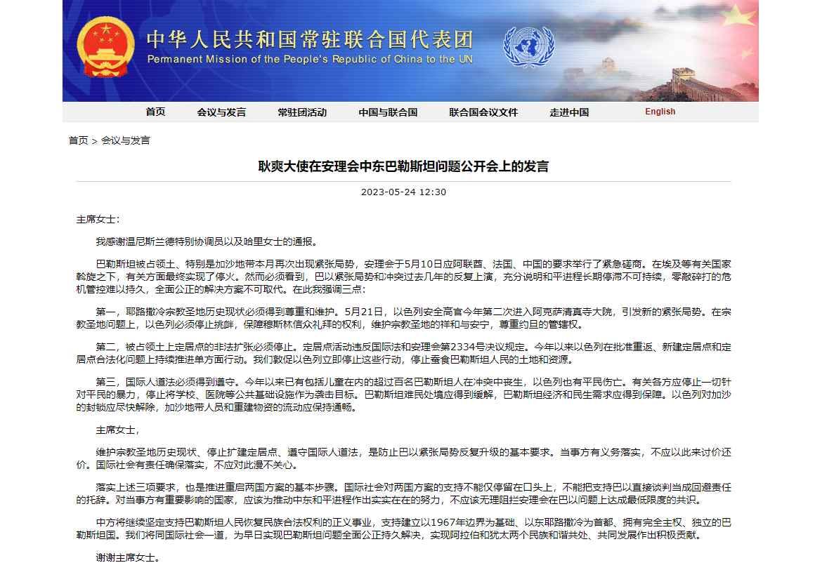 耿爽在安理會中東巴勒斯坦問題公開會上表示,耶路撒冷宗教聖地歷史現狀必須得到尊重和維護。5月21日,以色列安全高官今年第二次進入阿克薩清真寺大院,引發新的緊張局勢。在宗教聖地問題上,以色列必須停止挑釁,保障穆斯林信眾禮拜的權利,維護宗教聖地的祥和與安寧,尊重約旦的管轄權。 耿爽表示,國際人道法必須得到遵守。今年以來已有包括兒童在內的超過百名巴勒斯坦人在衝突中喪生,以色列也有平民傷亡。有關各方應停止一切針對平民的暴力,停止將學校、醫院等公共基礎設施作為襲擊目標。巴勒斯坦難民處境應得到緩解,巴勒斯坦經濟和民生需求應得到保障。以色列對加沙的封鎖應盡快解除,加沙地帶人員和重建物資的流動應保持通暢。 耿爽強調,維護宗教聖地歷史現狀、停止擴建定居點、遵守國際人道法,是防止巴以緊張局勢反復升級的基本要求。當事方有義務落實,不應以此來討價還價。落實上述三項要求,也是推進重啟“兩國方案”的基本步驟。國際社會對“兩國方案”的支持不能僅停留在口頭上,不能把支持巴以直接談判當成迴避責任的托辭。對當事方有重要影響的國家,應該為推動中東和平進程作出實實在在的努力,不應該無理阻攔安理會在巴以問題上達成最低限度的共識。 耿爽強調,中方將繼續堅定支持巴勒斯坦人民恢復民族合法權利的正義事業,支持建立以1967年邊界為基礎、以東耶路撒冷為首都、擁有完全主權、獨立的巴勒斯坦國。中方將同國際社會一道,為早日實現巴勒斯坦問題全面公正持久解決,實現阿拉伯和猶太兩個民族和諧共處、共同發展作出積極貢獻。(完) 【編輯:丘志彬】