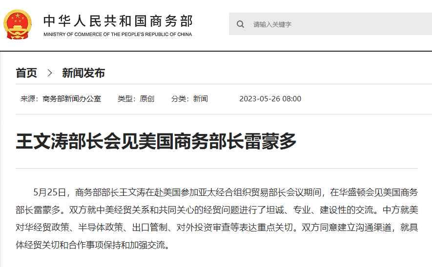 香港新聞網5月26日電 5月25日,中國商務部部長王文濤在赴美國參加亞太經合組織貿易部長會議期間,在華盛頓會見美國商務部長雷蒙多。雙方就中美經貿關係和共同關心的經貿問題進行了坦誠、專業、建設性的交流。中方就美對華經貿政策、半導體政策、出口管制、對外投資審查等表達重點關切。雙方同意建立溝通渠道,就具體經貿關切和合作事項保持和加強交流。