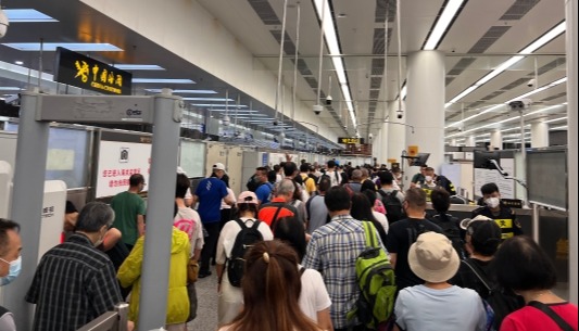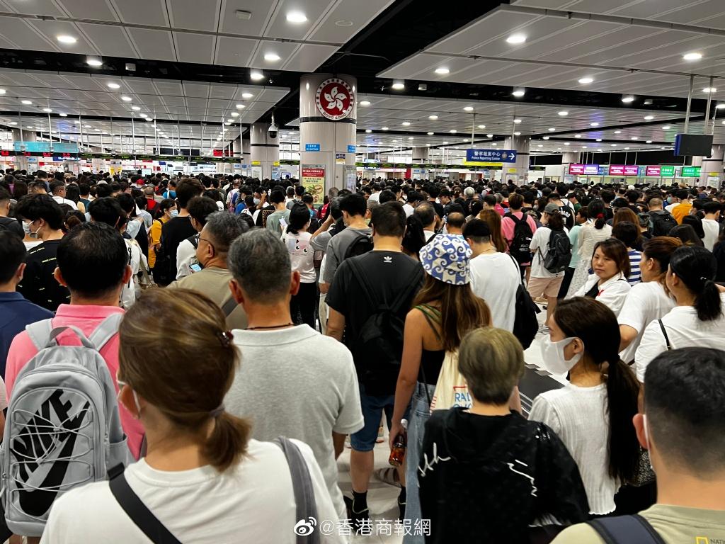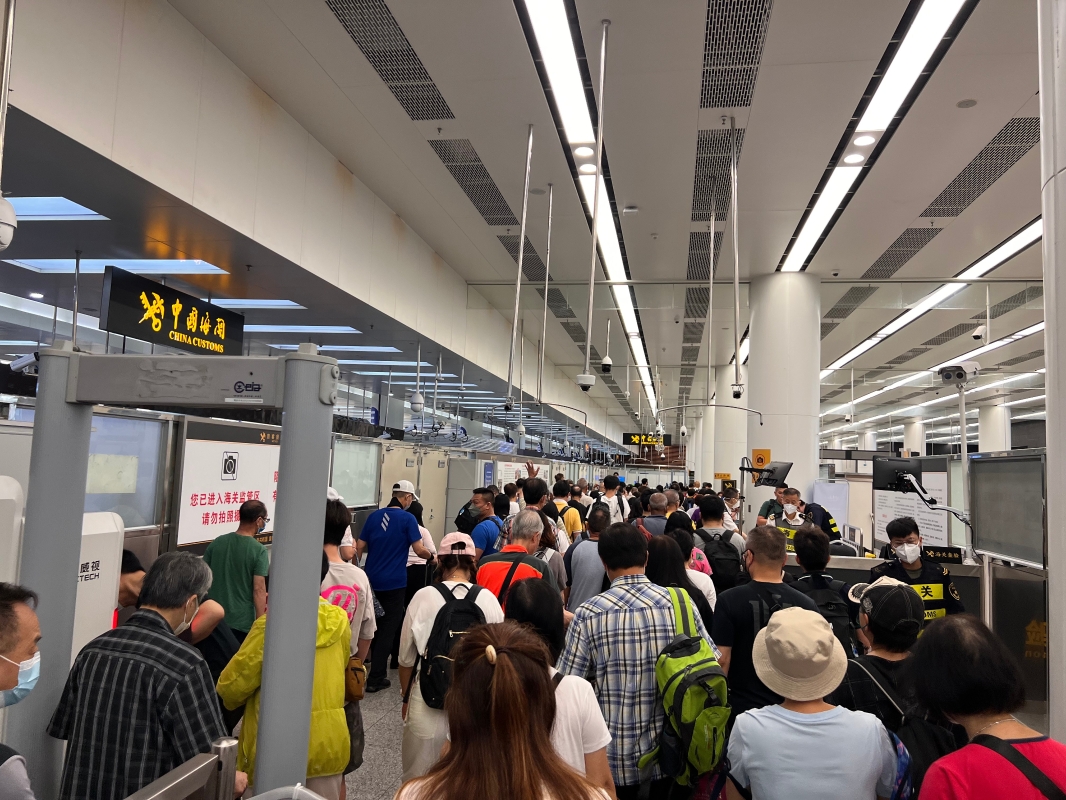早上八點多,深圳福田口岸已經人潮湧湧。圖片來源:香港新聞網 到了中午時間,有在落馬洲/福田口岸排隊等待通關的市民說:“從來沒見過落馬洲/福田口岸可以滿成這個樣子。”口岸內的廣播不停講“過境大堂十分擠逼!請聽職員指揮!”