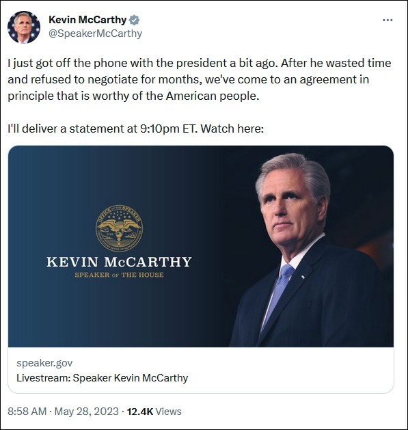 麥卡錫:與白宮防止債務違約達成原則性協議分享到: