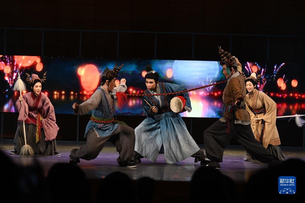 香港中通社北京5月28日電(香港中通社特約記者 莊恭)5月27日晚,在中國國家博物館劇場的舞台上,該館“古代中國”基本陳列秦漢單元中的擊鼓說唱俑等明星文物,在舞台劇《盛世歡歌》中“活”起來了,與現場觀眾進行了一次時空交匯。 據了解,該舞台劇是國博館與中國傳媒大學共同出品的首部原創文物活化舞台劇《盛世歡歌》。在一個小時的演出中,演員們神態詼諧、形態逼真的表演,將中國傳統的雜耍、說唱、戲曲等表演藝術,與現代話劇、歌劇、音樂、舞蹈、相聲、說唱等藝術融合,讓靜謐兩千年的文物在國博館的舞台活起來,引發現場觀眾的陣陣掌聲和叫好聲。