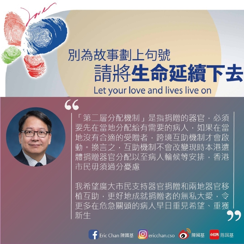 (圖源:陳國基FB) 香港醫務衞生局局長盧寵茂昨日亦表示,市民對香港與内地的跨境器官互助制度,或因網上不實言論,產生誤解,局方會盡量解説。強調器官捐贈名冊的登記或取消,是出於市民的自願,警方的調查工作則是針對造謠、作假行為。 【編輯:刘春】
