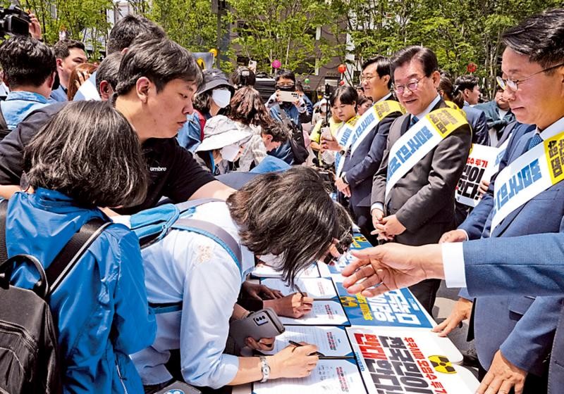 韓國民眾簽名反對日本核污水排海。圖源:大公網 共同民主黨黨首李在明26日在徵集反對簽名活動中表示,“正因為福島核電站的污染水很危險,對人體有害,他們才將其和海水混合,丟棄在海洋。”李在明此前還說,這種行為和在井中投毒無異。共同民主黨內部也有不少人發聲嘲諷,“核污水既然安全,就喝了試試”“請韓國總統府訂購福島核污染礦泉水”。 日本政府今年1月曾在內閣會議上確認,核污水排海時間為“今年春夏之際”,東電暫未公佈具體排放日期。對此,國際社會持續發出反對之聲。日本輿論調查會3月公佈的全日本輿論調查顯示,贊成核污水排海的民眾僅有26%。