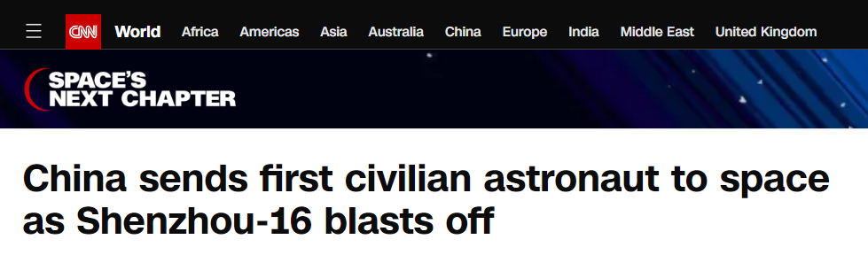 CNN報道截圖 北京時間5月30日上午9時31分,神舟十六號載人飛船在長征二號F遙十六運載火箭的搭載下,從酒泉衛星發射中心點火昇空,搭載著景海鵬、朱楊柱和桂海潮三名航天員進入預定軌道,航天員乘組狀態良好,發射取得圓滿成功。 此次任務是中國載人航天工程進入空間站應用與發展階段的首次載人飛行任務,是工程立項實施以來的第29次發射任務,也是長征系列運載火箭的第475次飛行。 當天,神舟十六號載人飛船與空間站組合體成功實現自主快速交會對接,神舟十六號航天員乘組從飛船返回艙進入軌道艙,神舟十五號航天員乘組和神舟十六號航天員乘組順利在“天宮”會師。