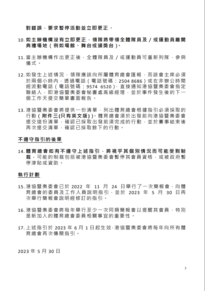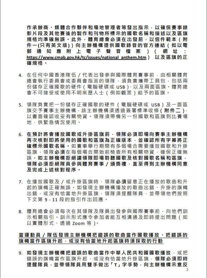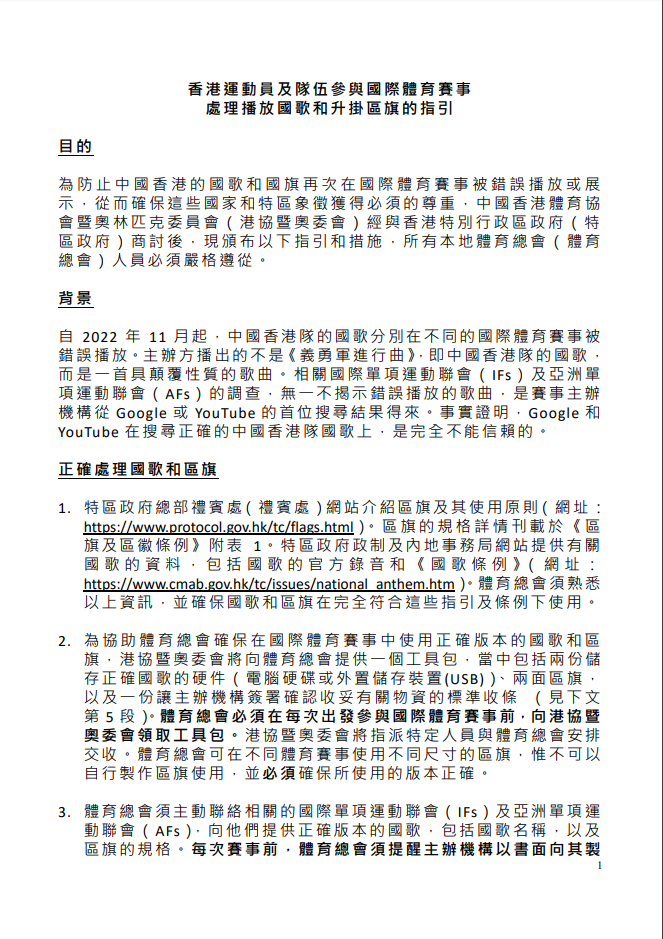 (圖源:港協暨奧委會FB) 指引亦列明,在預計將會播放國歌或升掛區旗前,領隊必須即場向賽事主辦機構再次核對國歌和區旗,若主辦機構拒絕讓領隊核對,領隊必須拒絕隊員參與體育賽事或頒獎禮。 若主辦機構播放錯誤國歌或升起錯誤的旗幟等,指引指領隊帶領隊員作出回應後,應馬上向所屬體育總會匯報。而該會主席必須於兩小時內,透過電話直接通知港協暨奧委會指定聯絡人,並於事件發生後的下一個工作天提交簡單書面報告。 有關指引將於6月1日起生效。