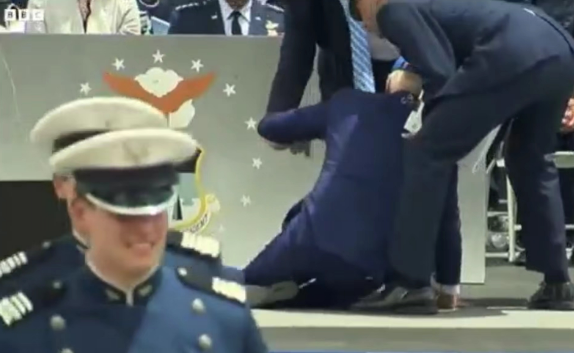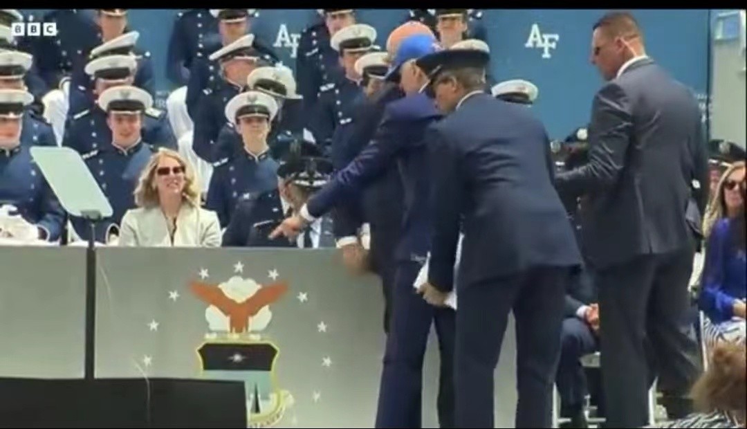 拜登當地時間6月1日在參加美國空軍學院畢業典禮時在講台上被絆倒。CNN視頻截圖