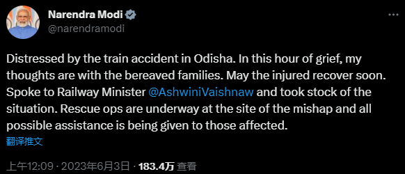 莫迪推特截圖 印度總理莫迪第一時間對事故遇難者表示哀悼。他在推特發文稱:“我對奧迪沙邦的火車事故感到痛心。在這悲痛的時刻,我的心與遇難者家屬同在。願傷者早日康複。我已與鐵道部長談話,評估了形勢。救援工作正在事故現場展開,向受影響的人提供一切可能的援助。” 一名事故幸存者向印度ANI通訊社描述了貨車相撞時的可怕景象。“事故發生時我正在睡覺,瞬間醒了過來。當我睜開眼睛時,大約有10至15個人壓在我身上。一切都失控了。”這名男性幸存者驚魂未定,他親眼看見現場“有很多人的手和腳都不見了”。 印度政府已展開調查,以查明事故發生的根本原因。 印度擁有世界上最大的火車網絡之一,儘管歷屆政府均投入大量資金來改善基礎設施,但事故仍很常見。 CNN援引數據稱,僅在2021年一年,印度全國發生鐵路事故近1.8萬起,死亡人數共計16431人。印度官方報告稱,“大多數(67.7%)的鐵路事故案例被報告為‘從火車上墜落以及與鐵軌上的人相撞’”。(完) 【編輯:王軼南】